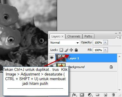 Tekan CTRL + J di layer foto untuk duplikat .. terus klik image>adjustment>desaturate atau tekan CTRL + SHIFT + U untuk membuat foto jadi hitam putih..