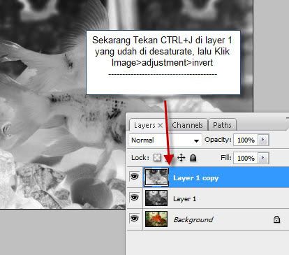 Sekarang tekan lagi CTRL+J di layer foto yang udah ter-Desaturate.Klik Image>adjustment>invert atau tekan CTRL+i