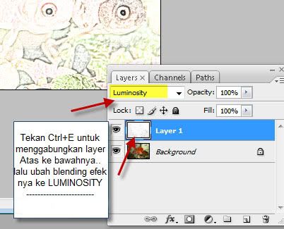 sekarang keliatan kayak gambar pake pensil.. Warnai dengan cara Tekan CTRL+E di layer paling atas (menggabungkan 2 layer. layer atas ke layer bawahnya). Ganti Layer Effect nya menjadi Luminosity.